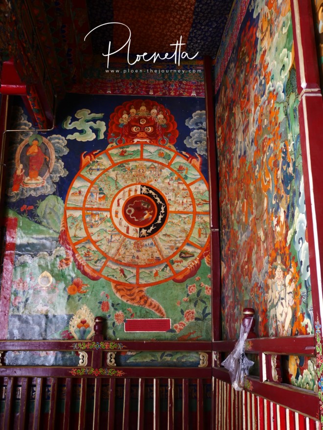 ไฮไลต์โดดเด่นที่เพลินชอบเป็นพิเศษคือพรมแขวนผนังลวดลายสวย บอกเล่าเรื่องราวตามคติความเชื่อพุทธมหายานแบบทิเบตค่ะ