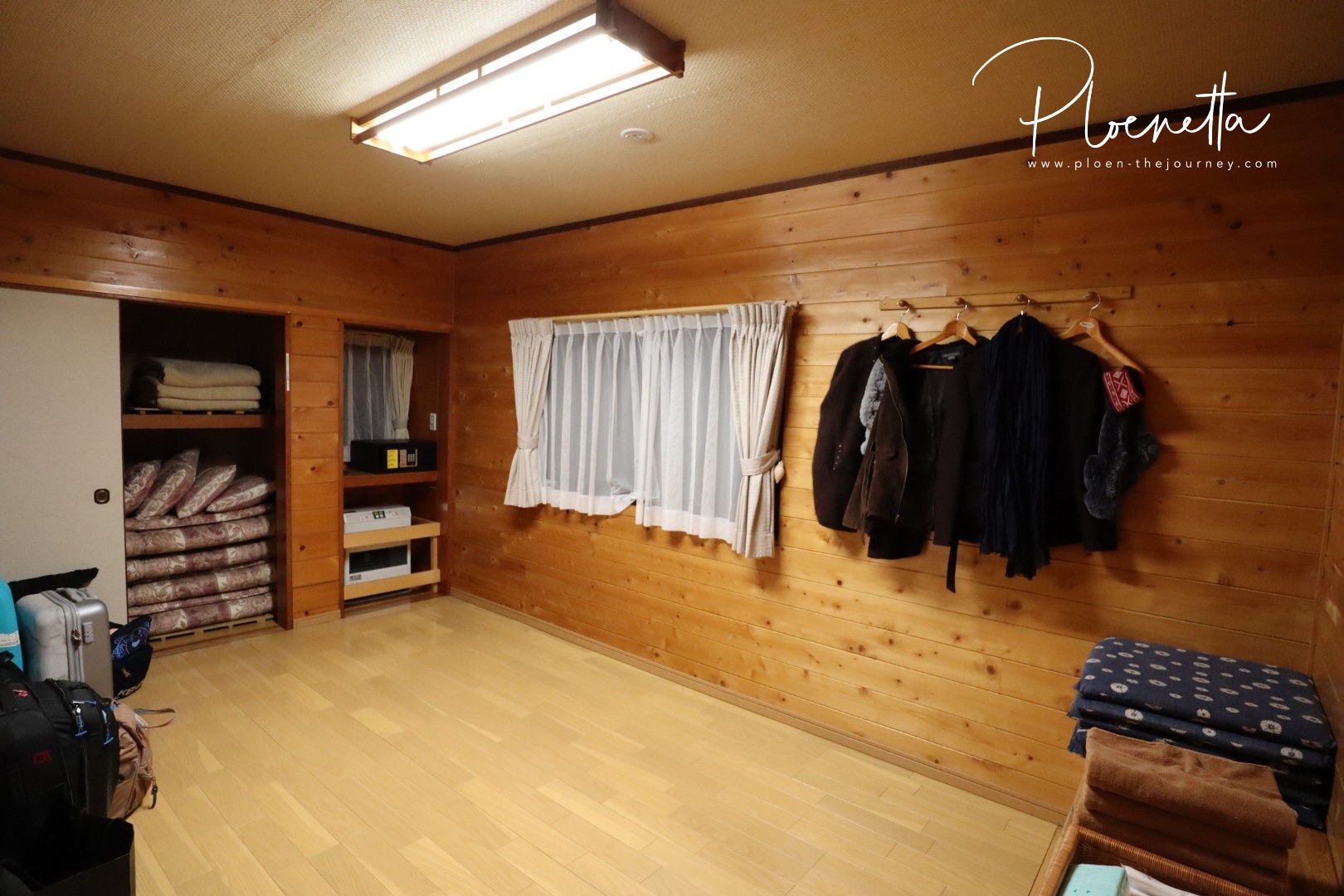 ฮีตเตอร์มีแต่ในโถงกลาง ดังนั้นคนที่นอนในห้องก็ต้องเปิดประตูไว้ ไม่งั้นหนาวพีคค่ะ อากาศคาวากูจิโกะเย็นกว่าคารุอิซาว่ามาก และยิ่งตอนกลางคืน…-6 องศาค่ะ