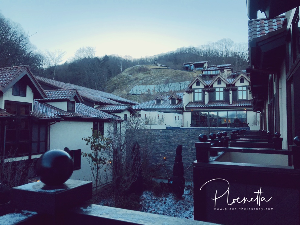 จากนั้นก็ออกมาเดินเล่นรอบ ๆ รีสอร์ตสักหน่อยค่ะ ฟ้าเริ่มมืดแล้ว รีบชมก่อนแสงหมด รีสอร์ตนี้กว้างทีเดียว มีหลายโซน และมีทะเลสาบสวย ๆ ให้ไปชมบรรยากาศด้วยนะคะ ตอนเราไปน้ำในทะเลสาบกลายเป็นน้ำแข็งแล้วค่ะ ได้อีกอารมณ์