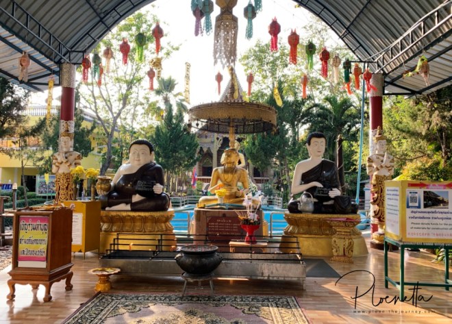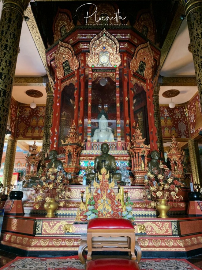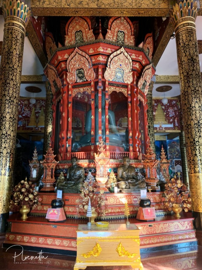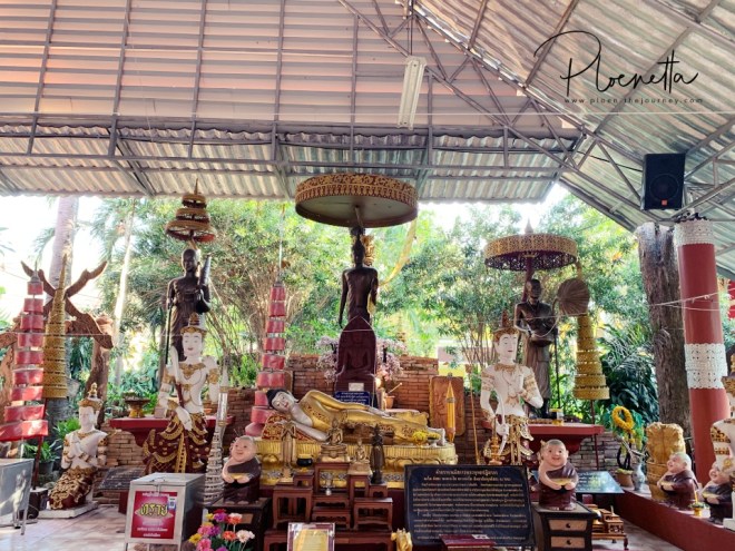 ด้วยทรงฐานเจดีย์มีความย่อมุม ดูคล้ายๆ จะหกเหลี่ยม กลางโถงก็เลยหันพระองค์ต่าง ๆ ไปตามมุมให้เราได้ทยอยไหว้