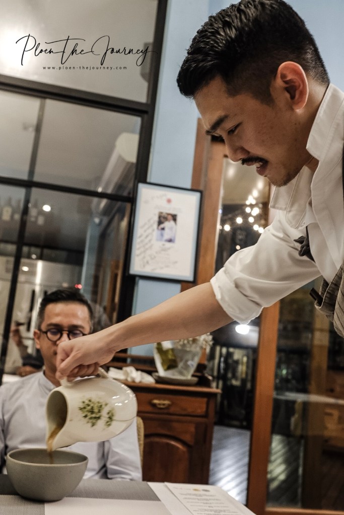 มาต่อที่ซุปบ้างค่ะ เมนูของเชฟเจ็ม ตอนแรกจะเสิร์ฟถ้วยที่มีเชสนัทกับเฮิร์บก่อน แล้วเชฟเจ็มจะเป็นคนมาเทน้ำซุปด้วยตัวเอง เห็นว่าเคี่ยวสต๊อกไว้สองวันแน่ะค่ะ กลมกล่อมมาก เพลินกินหมดเกลี้ยงในไม่ถึงยี่สิบวินาทีค่ะ ทานไปก็ดูหน้าเชฟเจ็มไปด้วย ยิ้มหวานน่ารักมาก