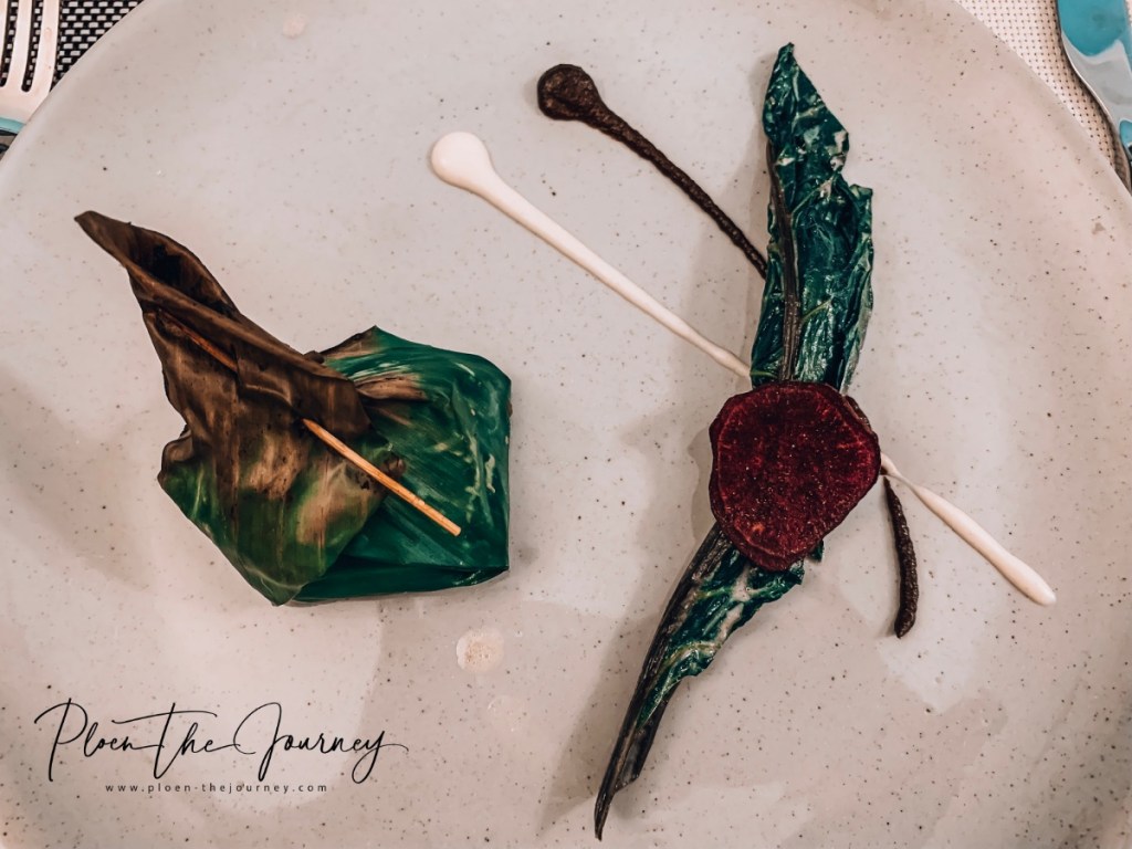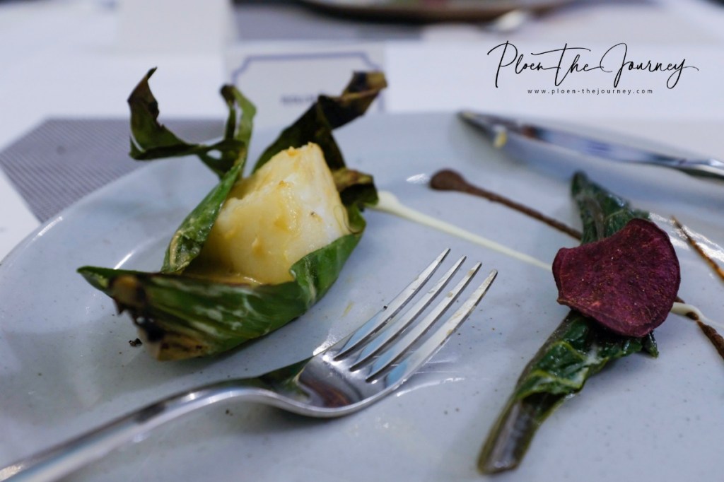 จานแรกคือ Black Cod marinated in Miso, Onion Compote ห่อใบตองมาน่ารักเลย แท่งด้านข้าง (ขวา) ก็สอดไส้ด้วยนะคะ ได้ texture หลายอย่าง รสชาติหลายรสเลยค่ะ