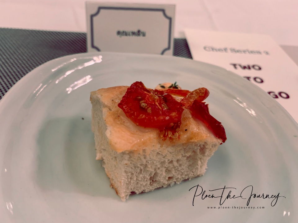 เริ่มจากเสิร์ฟขนมปังก่อน ไม่ใช่ขนมปังไก่กาธรรมดาน้า แต่เป็น Tomato Focaccia, Tomato Butter ขนมปังโฟกาเซีย (โฟกัชช่า ในภาษาอิตาเลียน) มะเขือเทศ คือตัวขนมปังมีมะเขือเทศด้วยเลย ทานคู่กับเนยมะเขือเทศก้อนกลมๆ เล็กๆ ข้างๆ