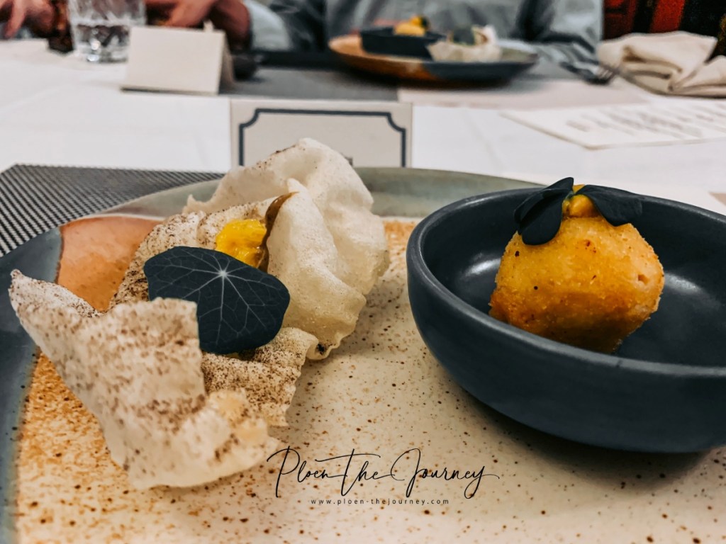 ลูกกลมๆ ขวามือคือซุปหัวหอมที่ทำเป็นก้อน มีชีสและมัสตาร์ด อร่อยมากกกกก เพลินชอบจานนี้มากค่ะ ตัวนี้เชฟเจ็มเป็นคนทำ ส่วนทางซ้ายจะคล้ายข้าวเกรียบแต่เนื้อบาง ได้รสเปรี้ยวๆ ของอะไรอีกหลายชั้น สดชื่นดีมากๆ ค่ะ เมนูนี้ของเชฟกันน์ค่ะ