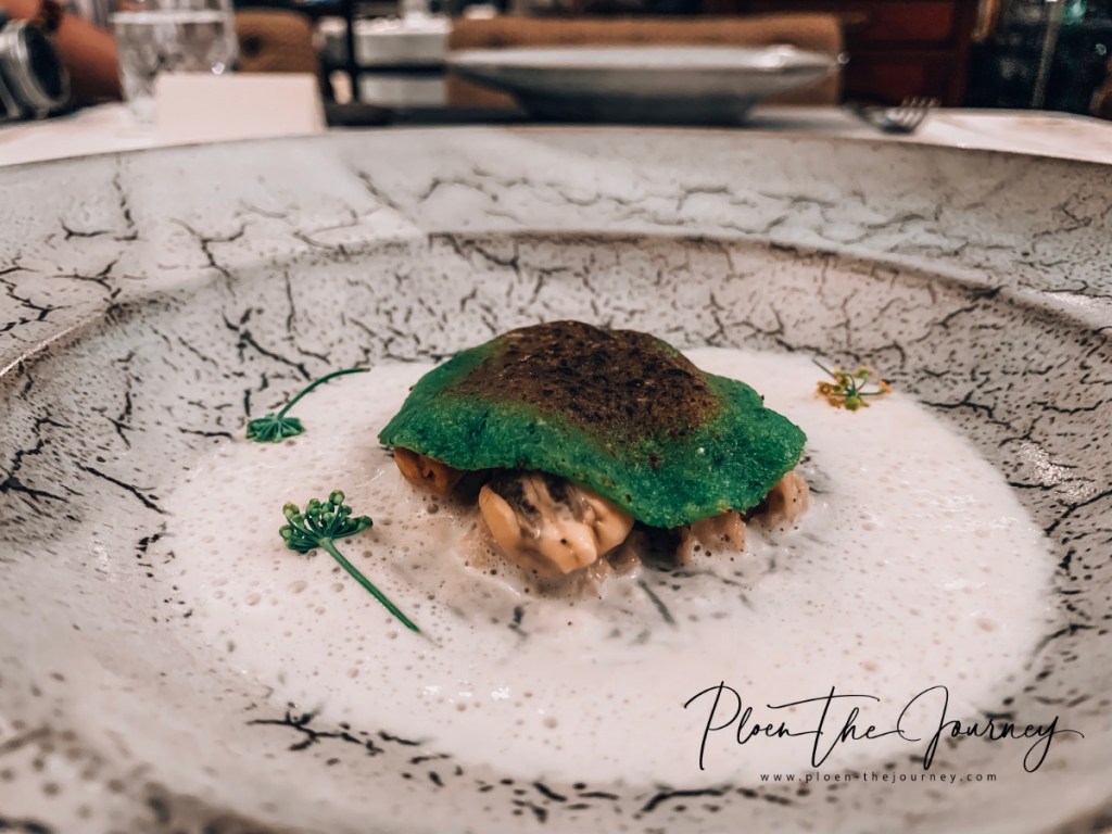 เชฟเจ็มแกะเปลือกหอยมาให้แล้ว ทานกับโฟมชีสต้นหอม ได้ทั้งรสชีสพอดีๆ กับรสครีม ลงตัวมากๆ