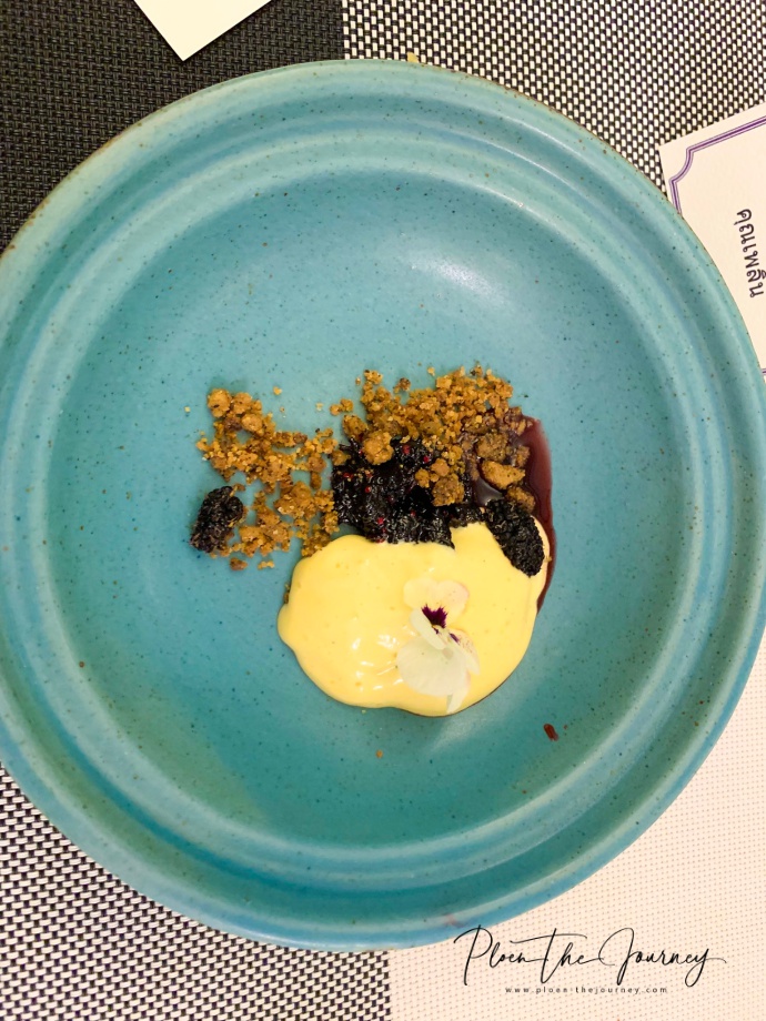 จานนี้คือ Mulberries, Rosella Peppercorn Sabayon แวบแรกที่ชิมรู้สึกว่าหวานจัง แต่เป็นเพราะเราตักส่วนเดียว คือควรจะกินทุกส่วนพร้อมกัน เพราะพอคำถัดมากินด้วยกัน อื้อหือ incredibly yummy! ไม่น่าเชื่อว่ามันจะกลมกล่อมพอดี