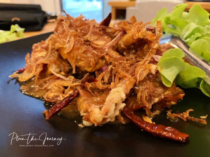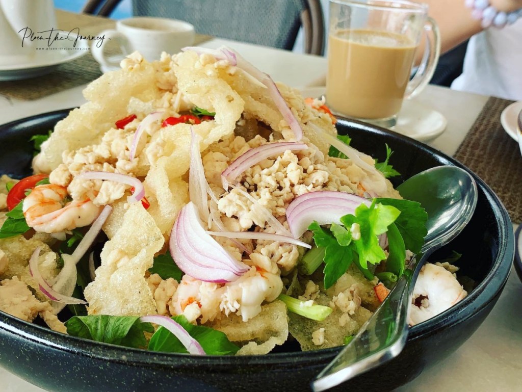 เจ้าถิ่นอย่างพี่ฉันสั่งเมนูที่นางคอนเฟิร์มแล้วว่าอร่อยมาให้อย่างยำเส้นใหญ่กรอบ เป็นเหมือนเส้นใหญ่ราดหน้าทอดกรอบ (ซึ่งฉันชอบเส้นแบบนี้มาก ๆ อยู่แล้ว) เอามายำคล้ายยำตะไคร้ผสมกับยำแบบยำวุ้นเส้น (แต่ไม่มีวุ้นเส้น) ใส่กุ้งเนื้อแน่น ๆ มาด้วย