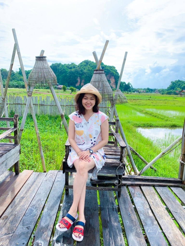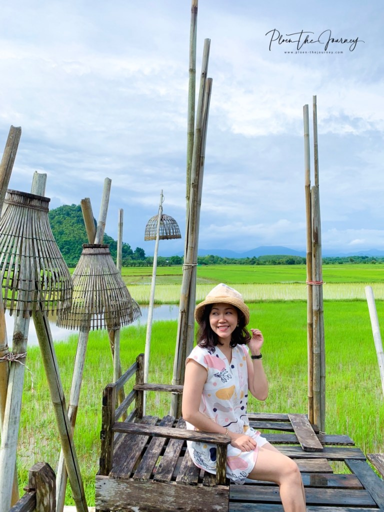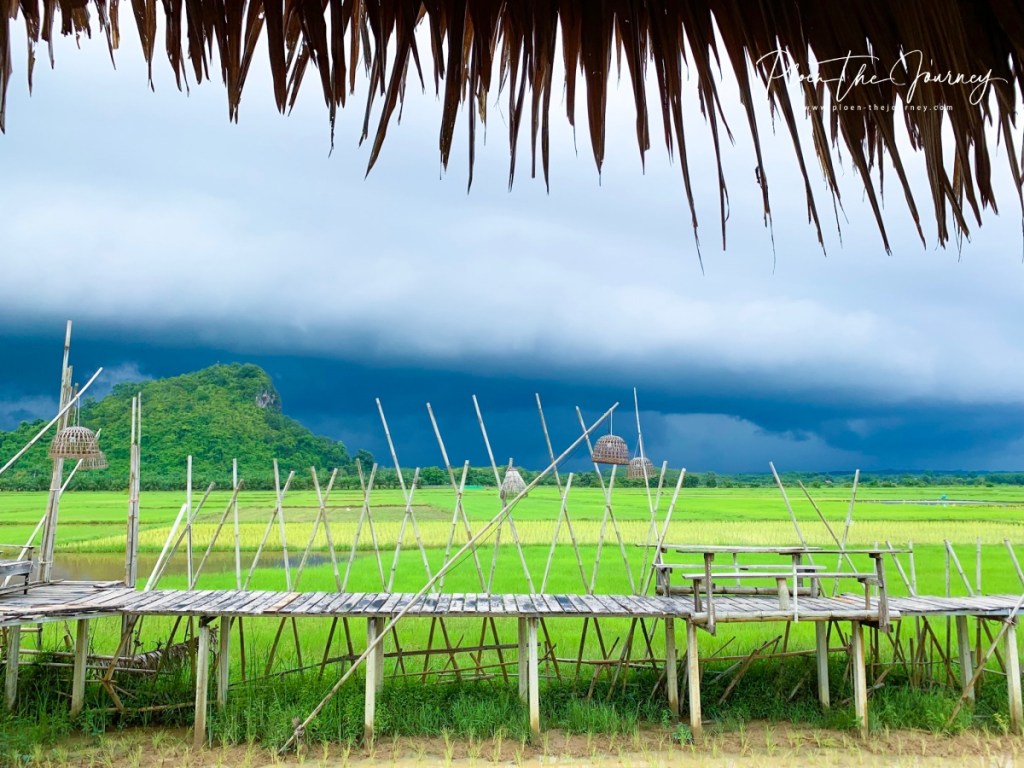 เราพยายามไม่ทานเยอะไม่ให้อิ่มเกินเพราะเดี๋ยวต้องไปอีกร้าน แต่ก็อิ่มจนได้ ฝนตกเบาสลับหนักกันไปเรื่อย ๆ จนเริ่มงงกับชีวิตว่าจะเอายังไง สุดท้ายพอหยุด นางก็พาเราไปที่ที่ตั้งใจไว้คือภูหลวง ลูกลม ร้านกลางทุ่งนา กลางวงล้อมขุนเขา นั่งรถออกไปนอกเมืองเล็กน้อย