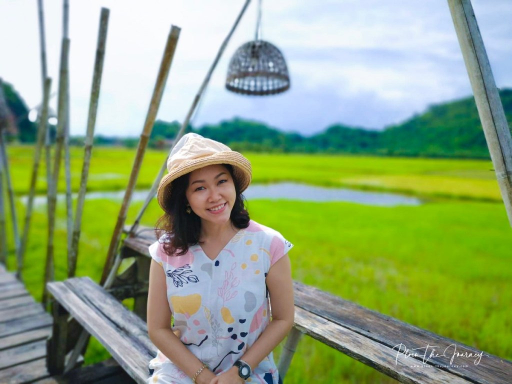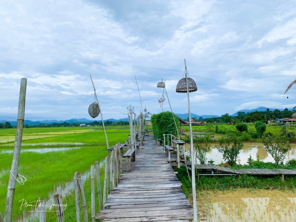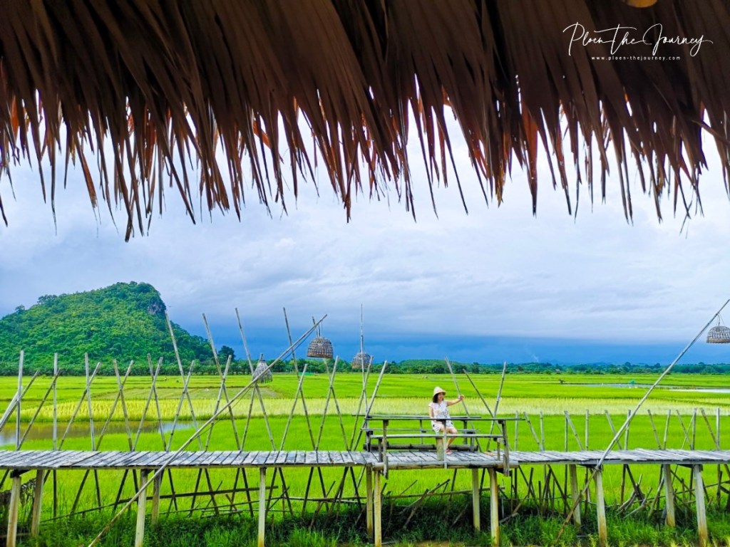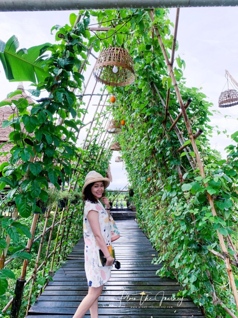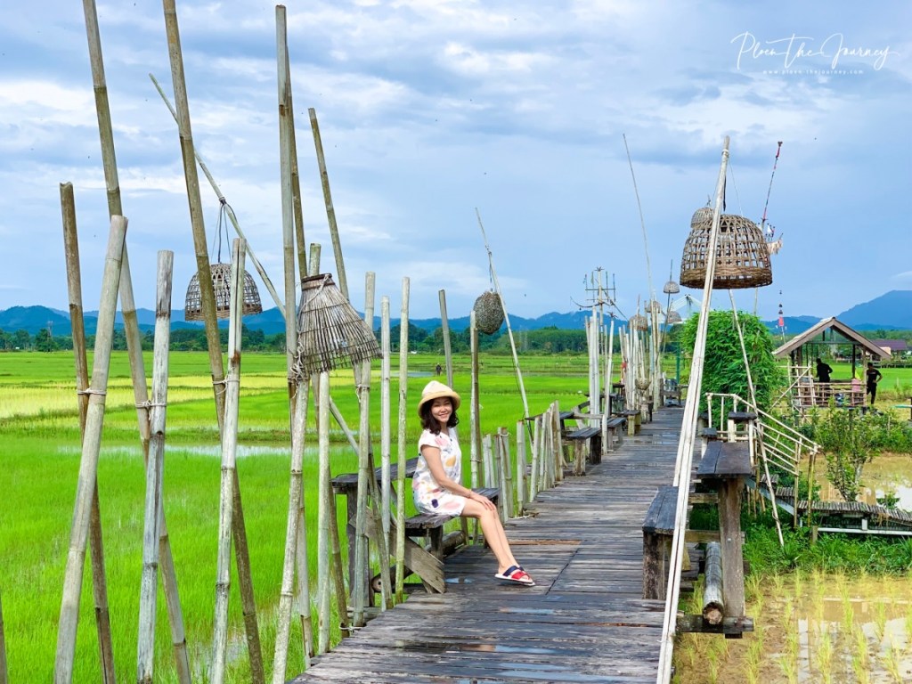 สักพักก่อนที่ฝนจะตก ฉันก็เลยชวนพี่ไปเดินเล่นกลางนา ไม่ได้ลุยแปลงนานะคะ แต่ทางร้านทำทางเดินยื่นต่อไปกลางนาให้ได้เดินกัน เราก็เลยไปเดินเล่น ถ่ายรูป ดื่มด่ำบรรยากาศตรงนั้นอยู่พักใหญ่ หอมกลิ่นดินกลิ่นหญ้าหลังฝนตกชื่นใจ