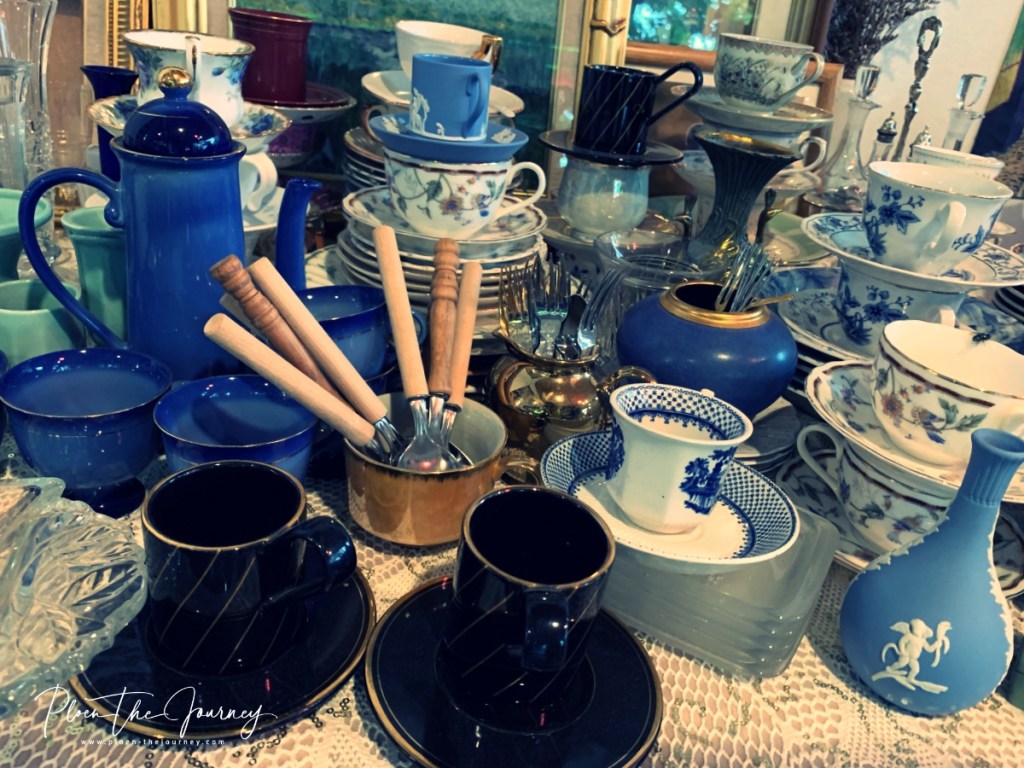 เรานั่งอ่านหนังสือ กินขนม จิบชากันสักพักฝนก็ยังไม่มีทีท่าซาลง ฉันเลยเดินไปเลือกถ้วยกาแฟกับจานรองวินเทจมาชุดนึง นั่งร้านขนมก็ชอปปิ้งได้นะเออ พักใหญ่ ๆ นู่นละฝนค่อยสงบลง เหลือโปรย ๆ อยู่บาง ๆ พี่สาวก็รู้สึกผิดหน่อย ๆ ที่ไม่มีที่พาฉันไปแล้ว ขับกันออกไปแป๊บนึงนางก็พูดถึงเขาพับผ้าที่ได้ยินฉันพูดก่อนหน้านี้ระหว่างขับรถผ่าน