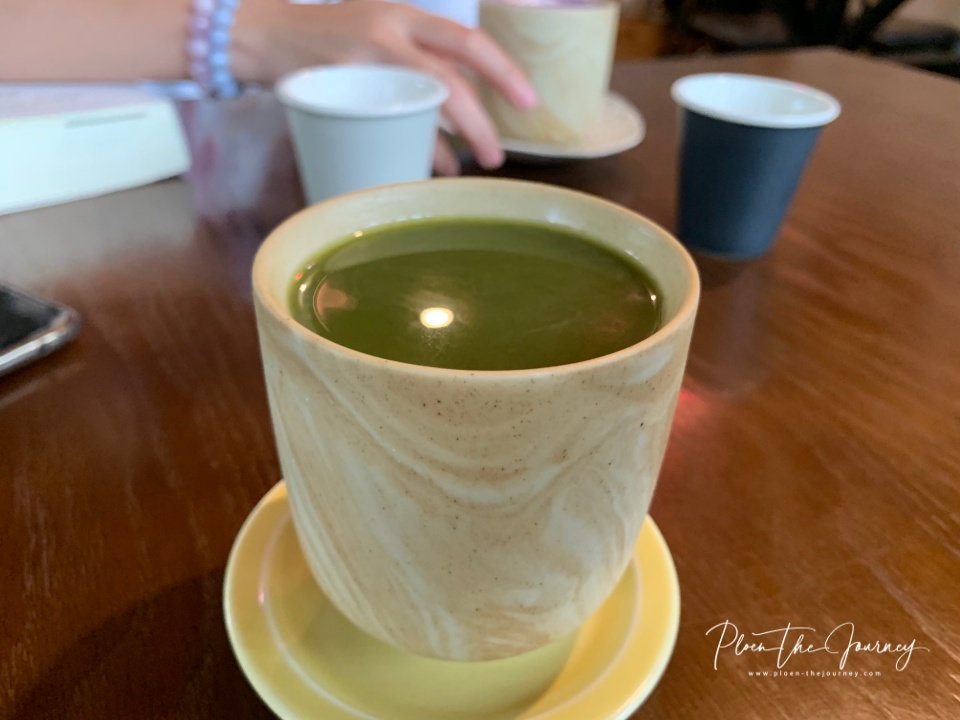 เนื่องจากฝนตกจนชื้นเย็น เป็นเวลาเหมาะกับเครื่องดื่มร้อน ๆ ฉันเลยสั่งมัทฉะร้อน ไม่ใส่นม รสออกมาเข้มกลมกล่อม จิบตัดรสเค้กได้ดีเลย