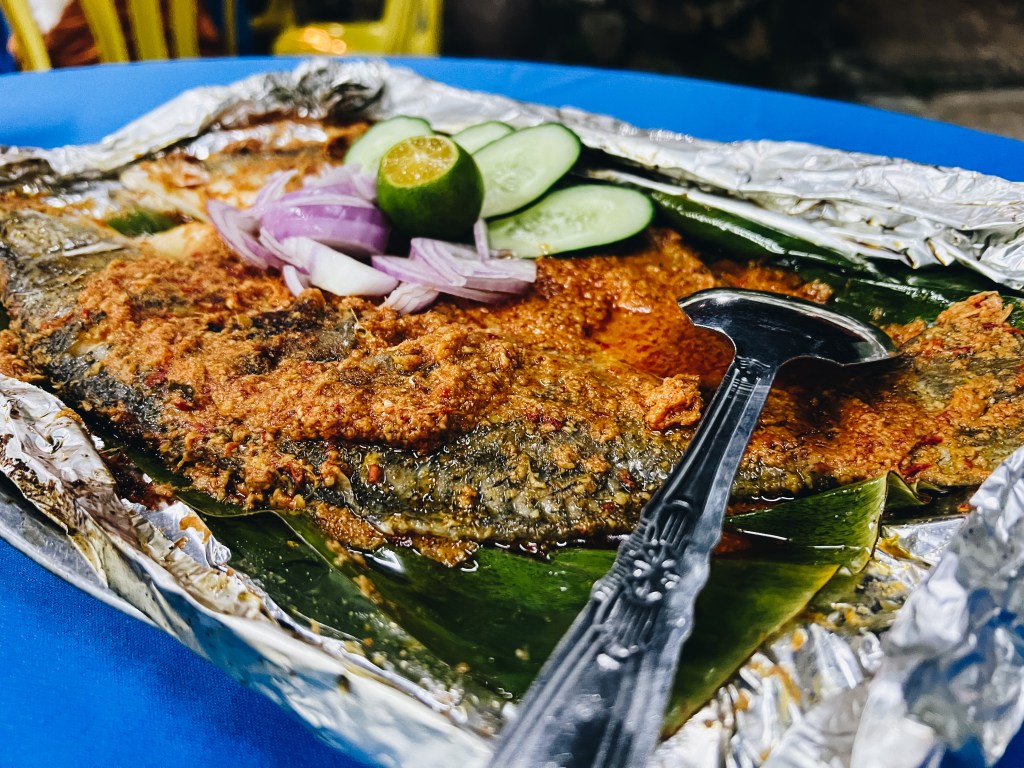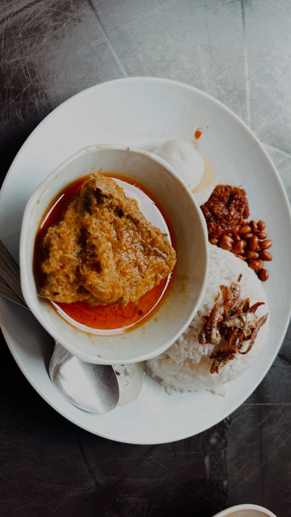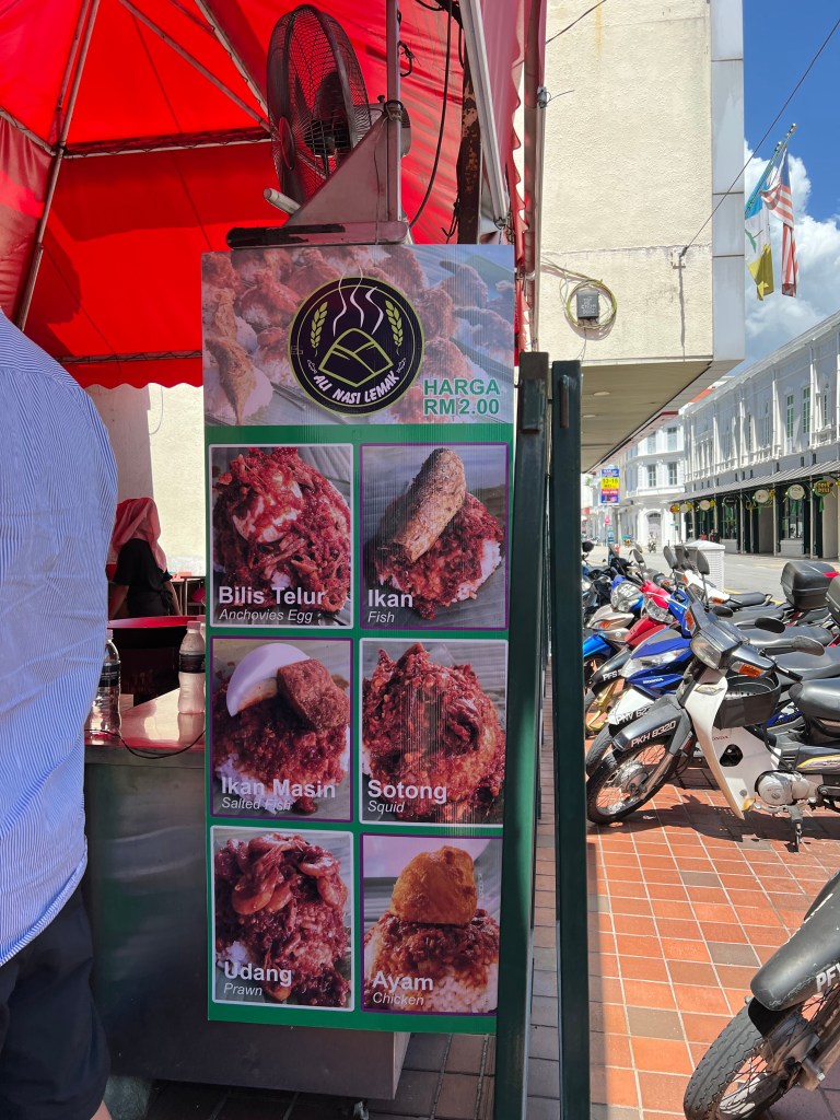 เดินเข้ามาปุ๊บ ร้านแรกเห็นคนต่อคิวเยอะมาก เป็น Nasi Lemak แบบห่อใบตอง จะสั่งไก่กับปลาหมึกก็หมดค่า เลยเลือกไข่ปลาแองโชวีและกุ้งแทน อ้างอิงจากป้ายเมนูว่า Udang (prawn) , Bilis Telur (Anchovies Egg)