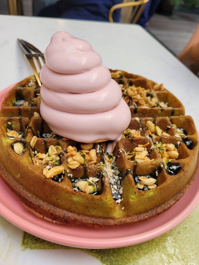 ก้าวแรกเข้ามา ได้กลิ่นหอมวาฟเฟิลโชยเตะจมูก ก็เลยต้องสั่งแล้วละ เราเลยสั่งวาฟเฟิลมัทฉะ ทานคู่ไอติม เลือกไม่ถูกว่าไอติมรสอะไรดี ก็เลยถามพนักงานว่าแนะนำกินคู่รสอะไรดี เขาแนะนำรสราสป์เบอร์รี่ ก็เลยจัดไปค่า พร้อมมัทฉะลาเต้