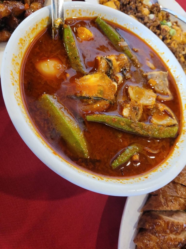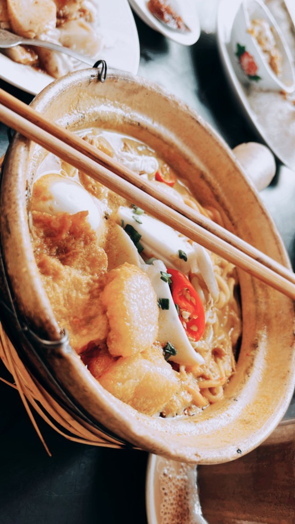 Laksa (ลักซา) เส้นขนมจีน กุ้ง ลูกชิ้นปลา เวลาเสิร์ฟจะโปะด้วยน้ำพริกและใบลักซา (ผักแพว) รสชาติเปรี้ยวด้วยน้ำมะขาม
